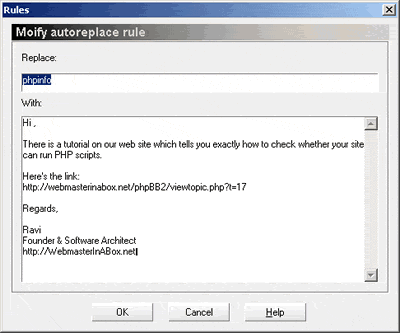 When you type the keyword in any text editor - Notepad, Outlook, Eudora, Word, Excel, Dreamweaver, Frontpage, etc - the pre-programmed text appears in a hover box (like a popup). If you wish to replace the keyword with the entire text, simply hit enter and the entire text is placed where your cursor is.