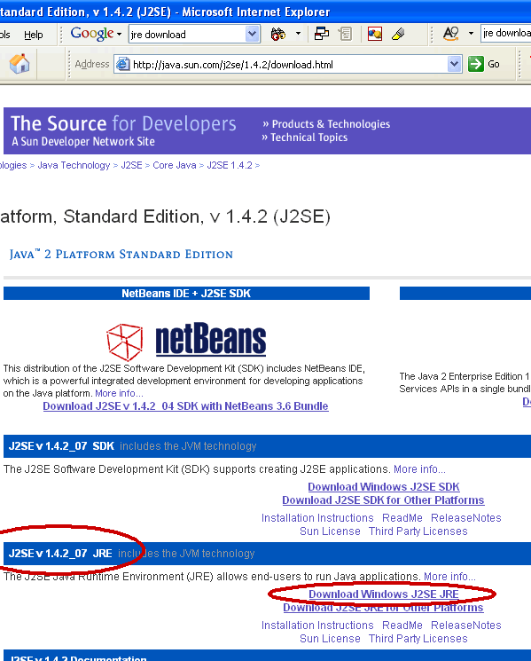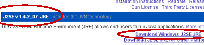 - Once the page has loaded, click on the link that should say something like "Download Windows J2SE JRE" under the heading "J2SE v1.4.2_xx JRE" (xx could change as the JRE gets updated). Click the image below to see a larger version.